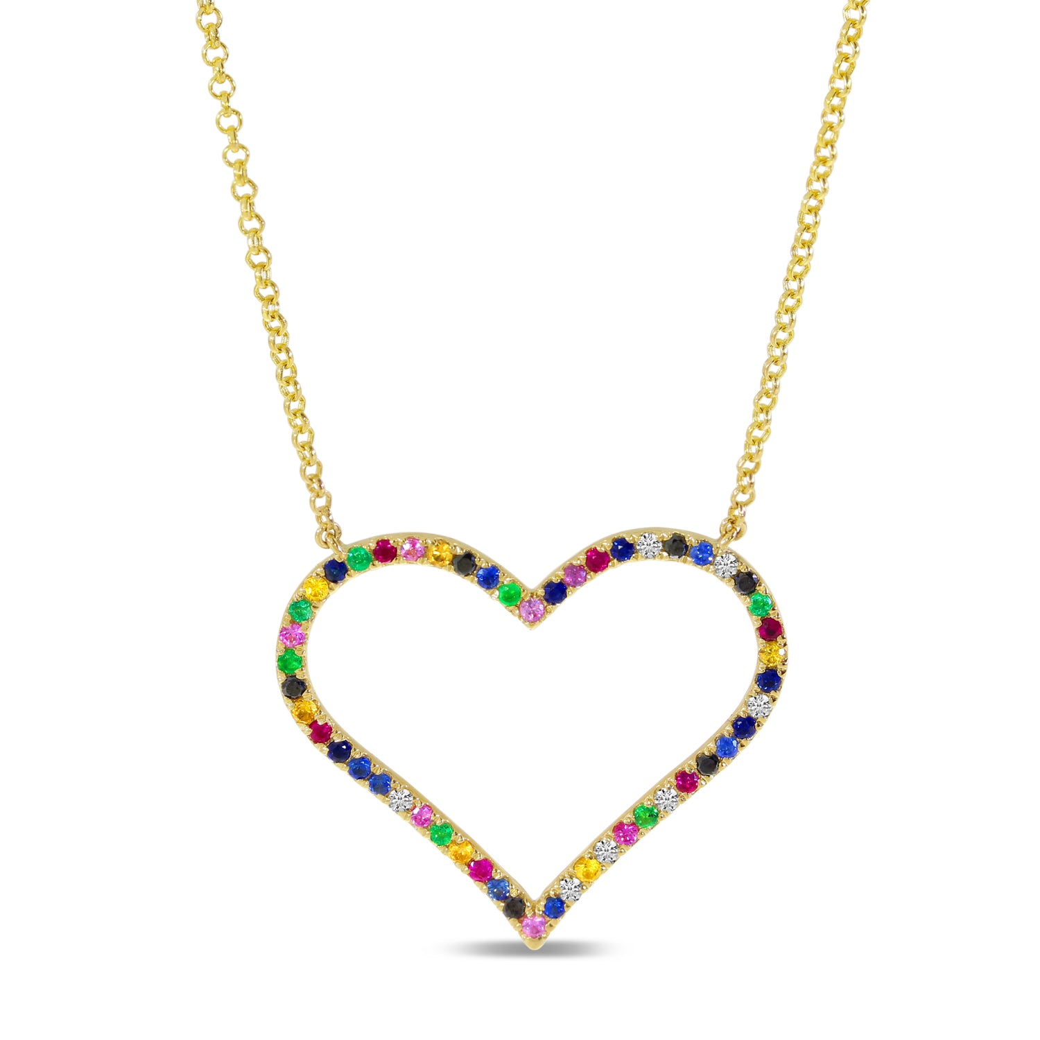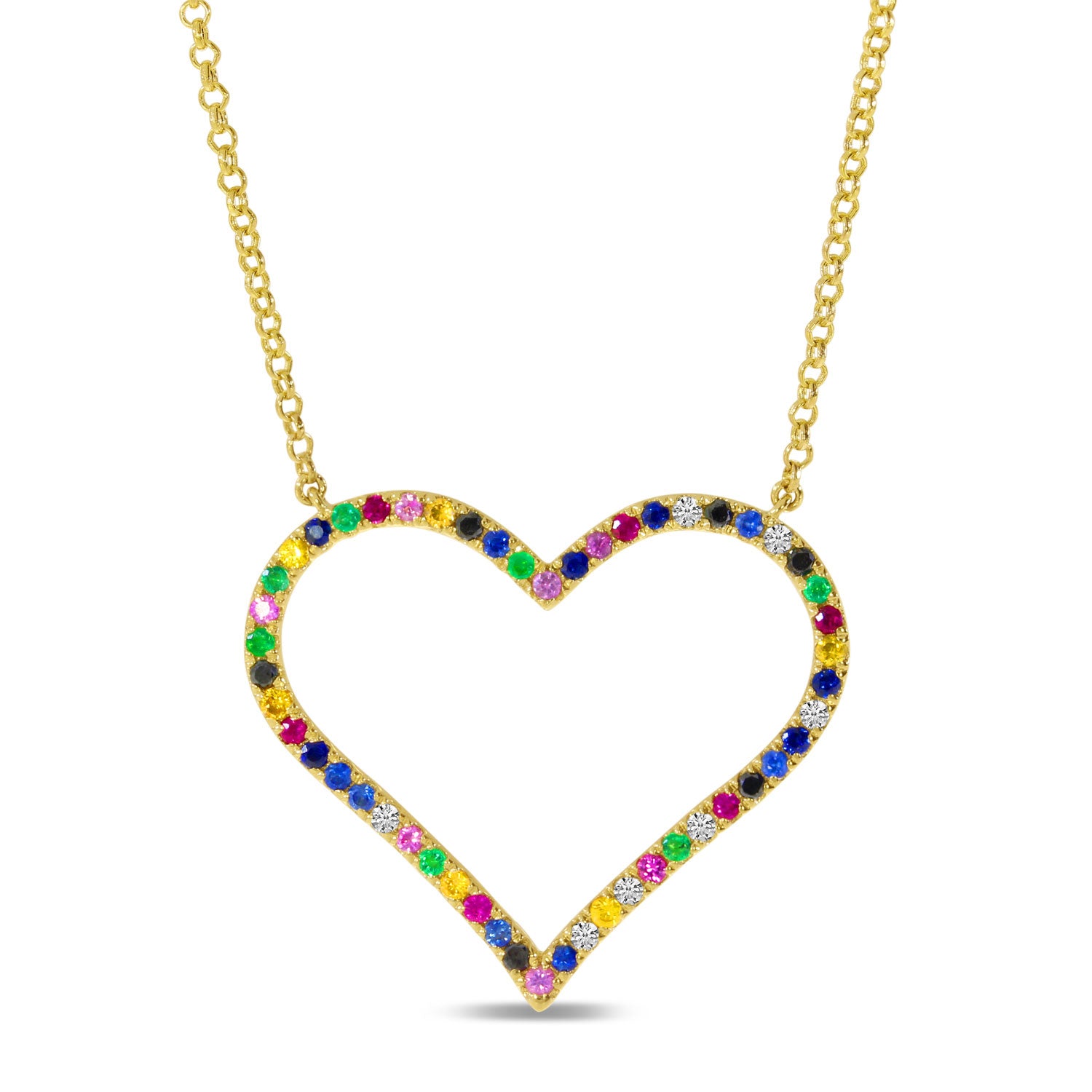 14K Yellow Gold Rainbow Sapphire Large Open Heart Necklace with 0.24 Cttw. Multi-Color Sapphires.